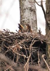 The owl nest featured on the Nature Cam page was discovered in February 2012. The nestlings were first spotted in early April, about a week or two after hatching. The eggs were incubated for about one month primarily by the female, although the male did step in from time to time to help. By the end of May, these two young owls should become fledglings, leaving the nest to practice flying under the close watch of the female. The family group will stay together throughout this summer, as the owlets learn to hunt and master the art of flying. In early fall, the owlets will leave the area in search of their own territories.
