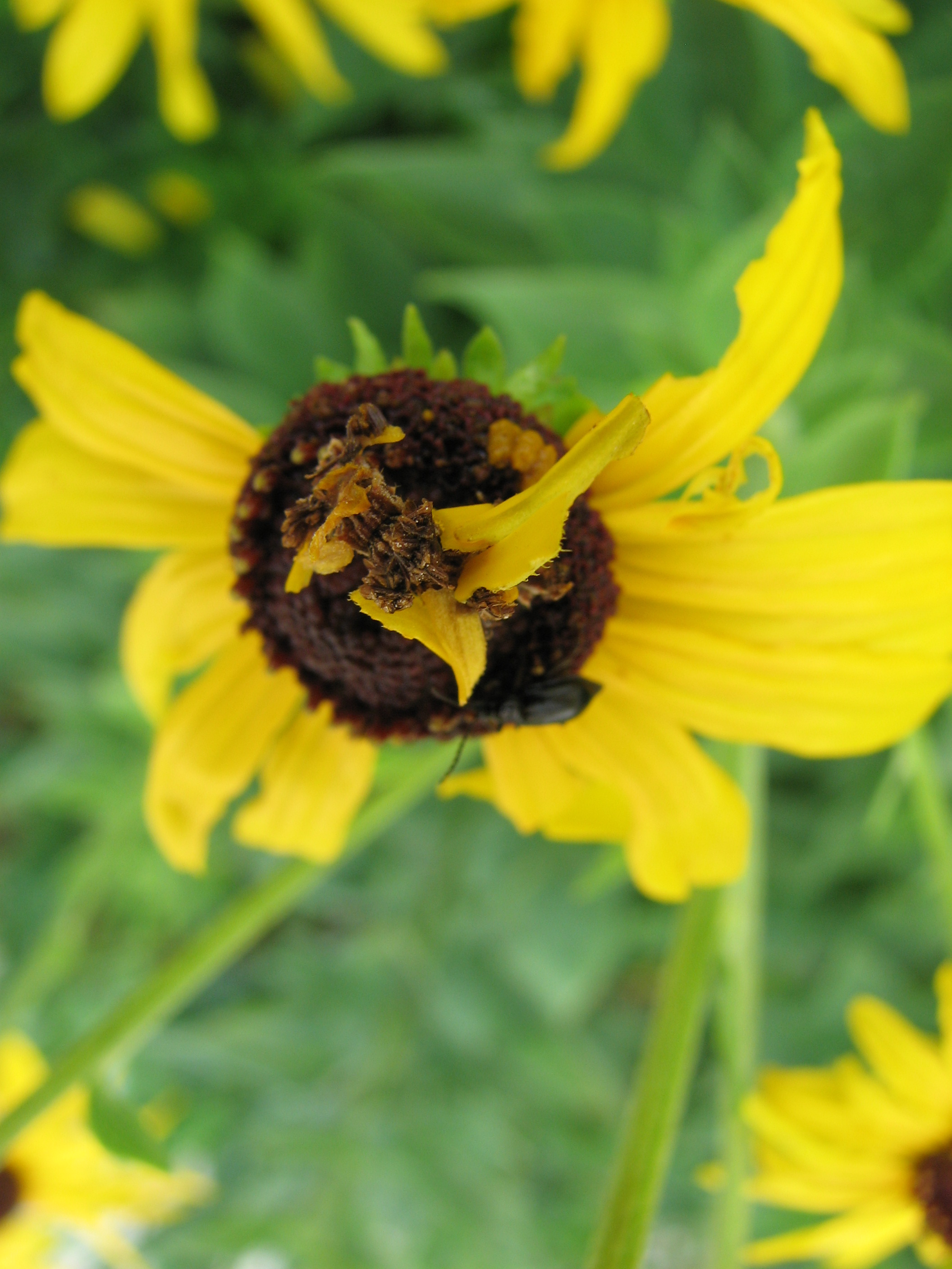 Our neighbor gave us a bundle of black eyed susan’s from her garden and we found one on the flowers. We have been keeping watch over the past few days watching it slowly change its disguise. Quite interesting to watch. We saw it had added the yellow petals to its body yesterday but today it seems to either stay in one spot just under the head of the flower on the steam or completely removed everything in one spot and is walking around exposed. I’m not sure what has happened over night but I will keep an eye out.