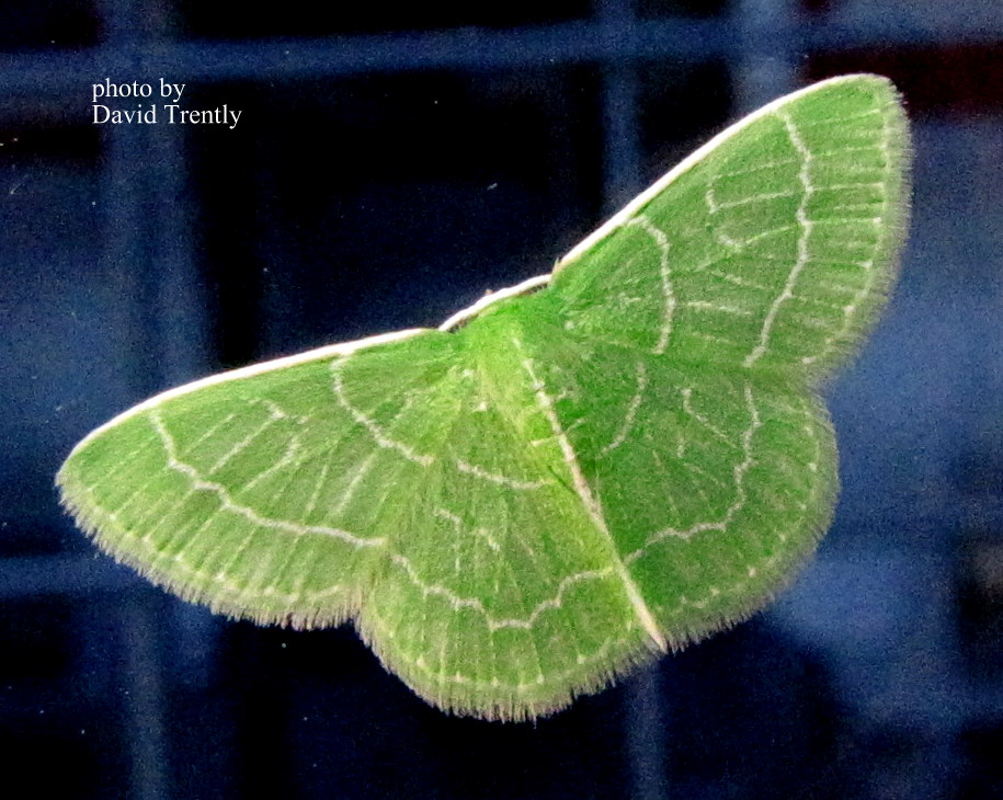 A camouflaged looper caterpillar will keep the plant materials attached to its exoskeleton until it molts, only to start the process of chewing and pasting again with each subsequent shedding of its outer covering. The partially grown larva overwinters and completes its metamorphosis in the spring to reveal its adult form—the wavy-lined emerald moth. Adult moths are nocturnal and are attracted to light. You may have seen this beauty fluttering around a porch light.