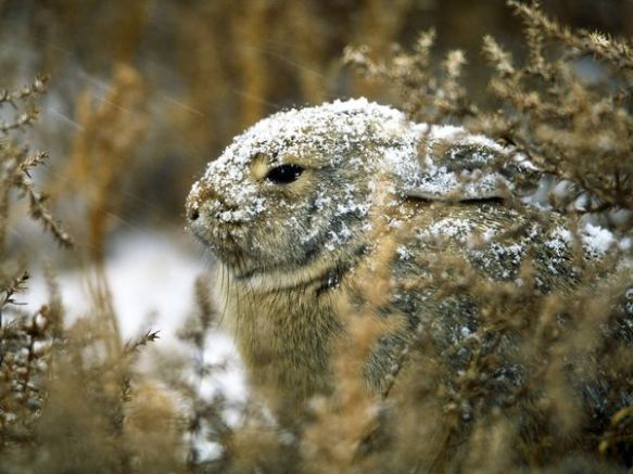 Cottontails are primarily crepuscular animals, which means they are most active at dawn and dusk; though they do have some nocturnal feeding habits. They spend snowy winter months snipping buds and twigs (at a precise 45-degree angle) off small trees and shrubs for sustenance. Saplings browsed by rabbits will eventually acquire a top-heavy appearance with stunted branches. Small, flattened spheres of scat (feces) can be seen throughout their feeding areas, making it easy to see where rabbits have feasted. Cottontails have adapted to this meager winter fare. In order to absorb more nutrients from their food, rabbits will eat their own scat as it is expelled. Cottontails have a very simple digestive system that makes it difficult to fully break down the woody fiber in their winter diet; thus, important vitamins remain in the scat.