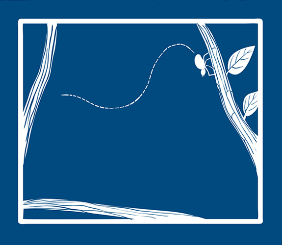 Step 1: The orb weaver spider grasps a stem and releases a thin strand of silk with “glue” at the end. The free end floats in the breeze until it sticks to something.