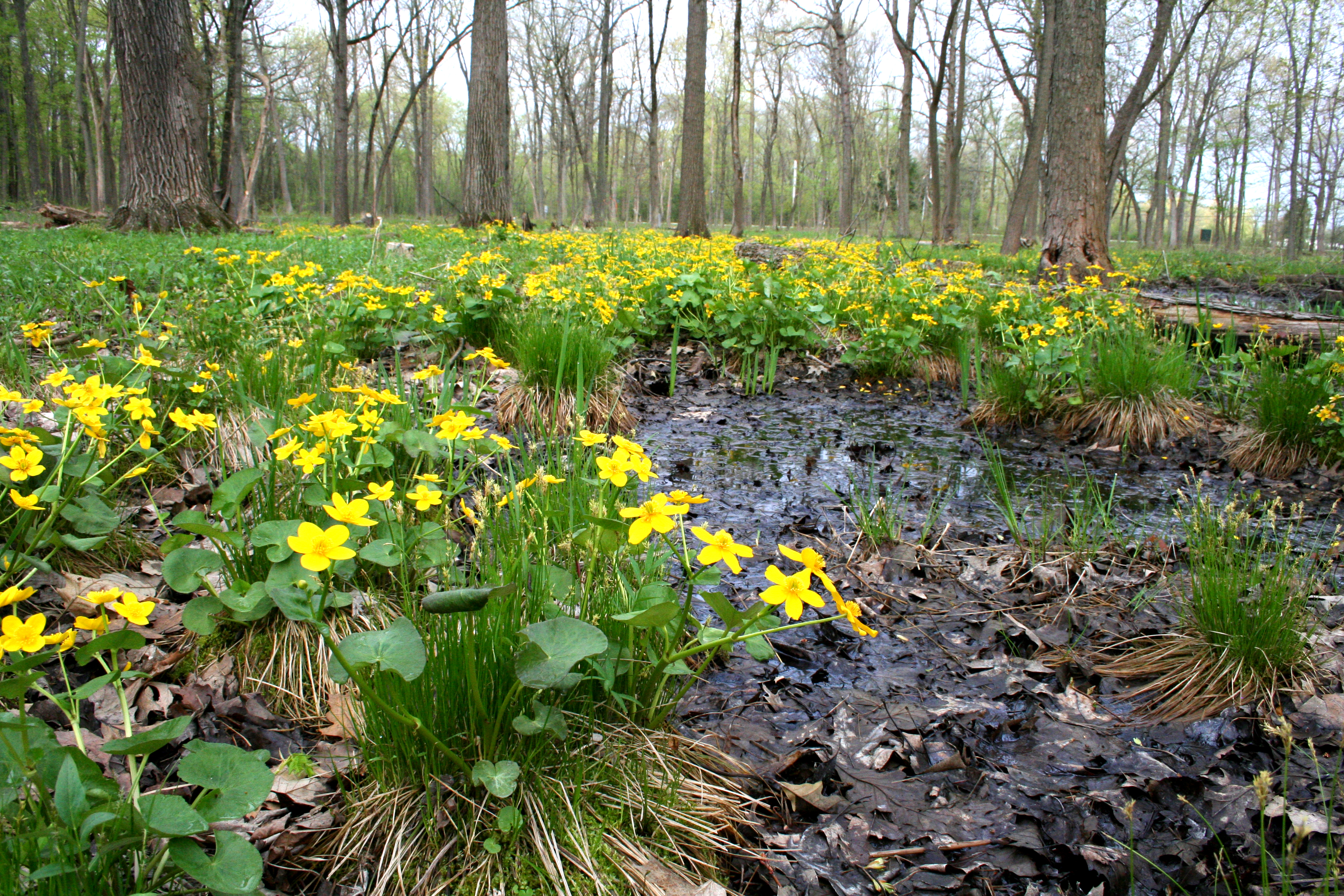 Winter visitors to these preserves, or vehicular passersby, will notice the use of heavy equipment, burning piles of brush, and an already visible difference in the openness of the woodland landscape. A number of canopy trees are being removed to increase the amount of sunlight reaching the ground. Visit these areas again when the leaves return, and early results of the Woodland Habitat Restoration Project will be obvious. Last spring, the increase in blooming marsh marigolds was visible to the casual onlooker, and the view into this woodland now has a more open feel. Monitoring efforts of plants and wildlife last spring and summer indicated positive results, and further research will quantify the long-term changes.
