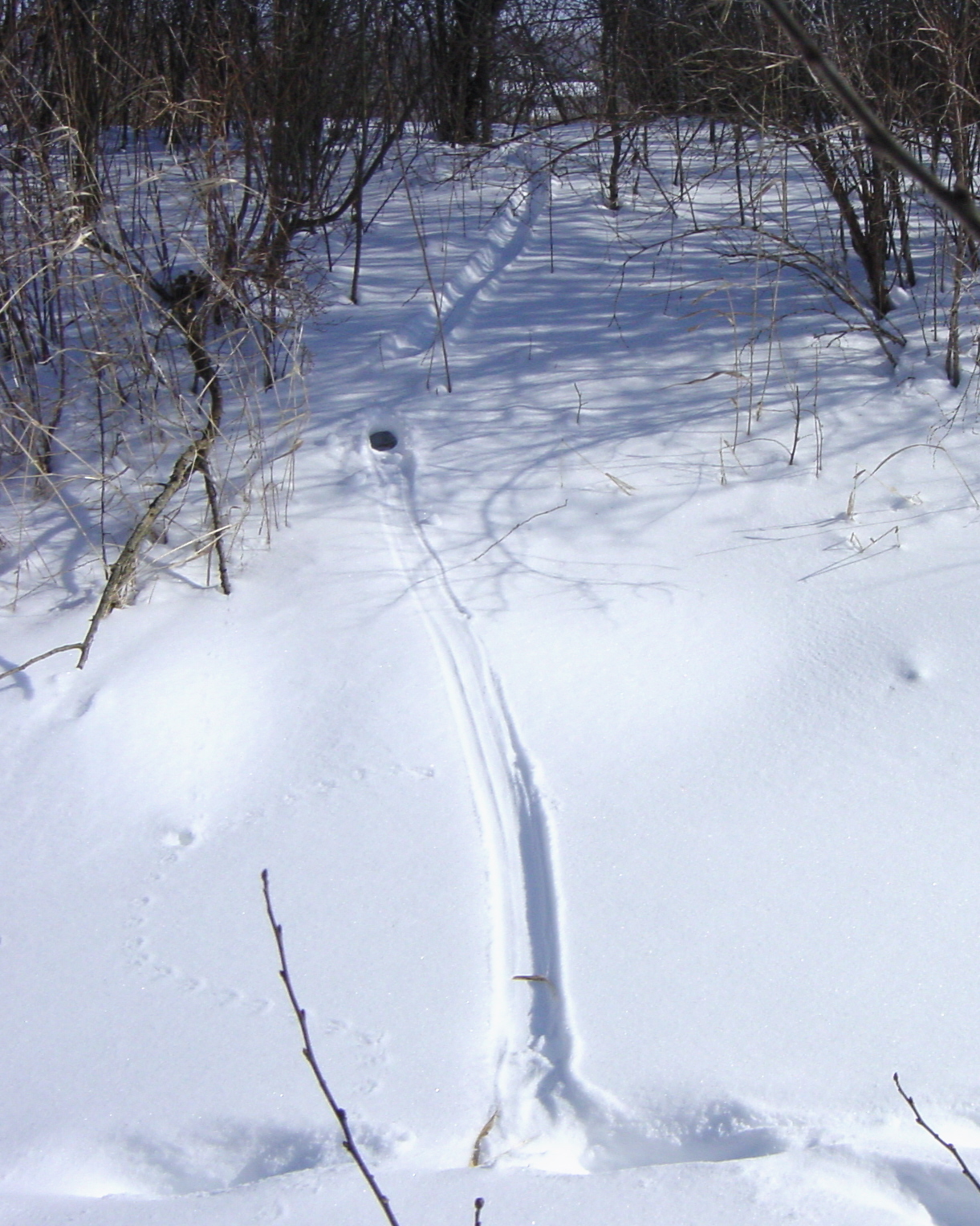 In the picture above, the tracks begin at the base of a tree and consist of two small impressions, side by side, with a line imprinted in between. The individual tracks are tiny compared to the tree and are difficult to see, but notice the other clues: the size, the hopping pattern (hind legs land ahead of the front legs), the tail dragging in the snow. Add it all together, and these tracks are unmistakably those of a mouse. The white-footed mouse (Peromyscus leucopus) is a good climber known to repair old bird nests in woodlands, creating a cozy winter home. Perhaps this nocturnal rodent scurried down from its arboreal home for a midnight snack.