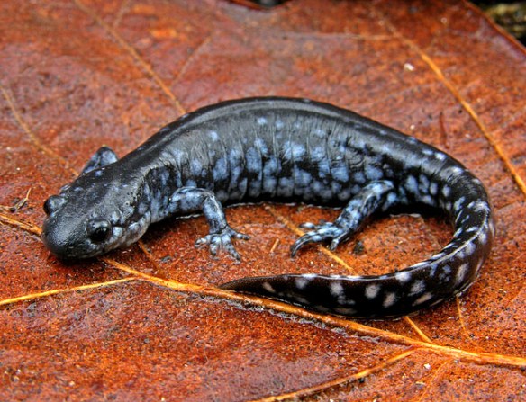 Blue-spotted salamanders are one of the earliest amphibians to breed in Lake County, Illinois. They mate “explosively” during the first three days of thaw, emerging en masse each evening at vernal pools, which are temporary woodland ponds created by snow melt, rain and rising water tables. Here the inhabitants are in a race against time. As soggy spring gives way to arid summer, these temporary reservoirs dry up. As treacherous as this ticking timeline may sound, its transient nature provides some advantage for defenseless creatures at the low-end of the food chain. Because these pools dry up each year, there’s no way for predators such as fish or bullfrogs to make their homes there.