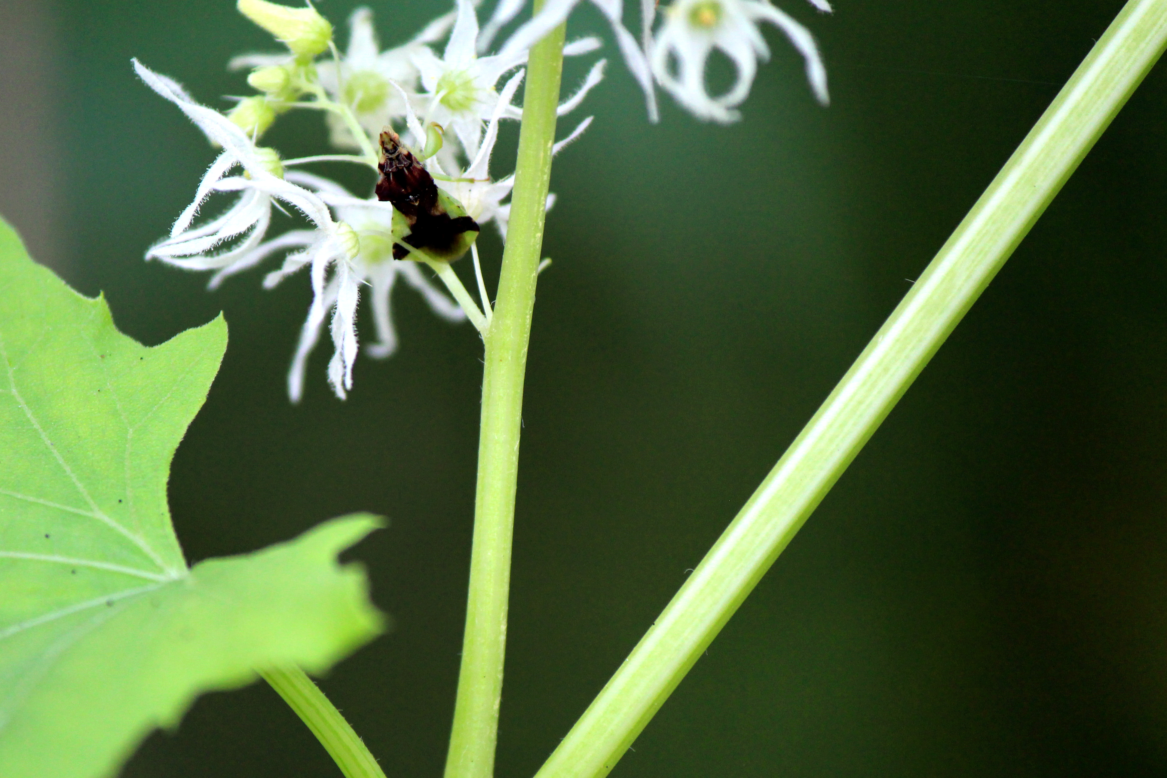We almost overlooked this ambush bug, hiding on a flowering wild cucumber vine. It was poised to pounce on the unsuspecting pollinators and squeeze them with his “Popeye” biceps. After a successful capture, ambush bugs jab their prey with a sucking mouthpart and inject an enzyme that digests the body contents of the prey.