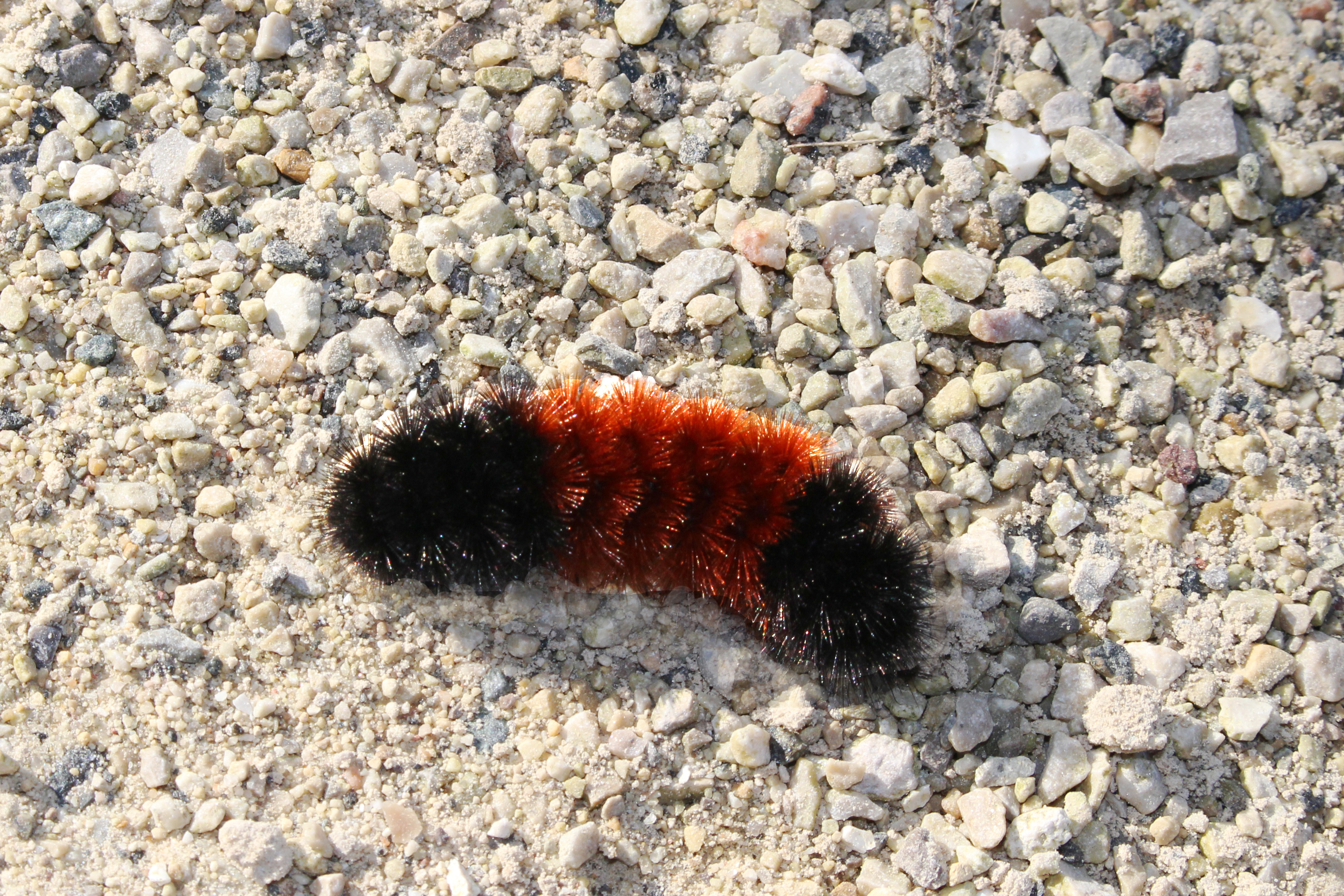 After eating its fill of a variety of green vegetation, this “wooly bear” caterpillar creeps across the trail, searching for a safe place under bark or inside the dark, protected cavities of rocks or logs to hibernate. While folklore tells us that the length and severity of the coming winter can be predicted using the length of this larva’s colored bands, science tells us that the burnt-orange central bands simply lengthen as the caterpillar ages. Once spring arrives, this caterpillar will crawl again and will quickly find a place to create a cocoon and pupate into an Isabella tiger moth.