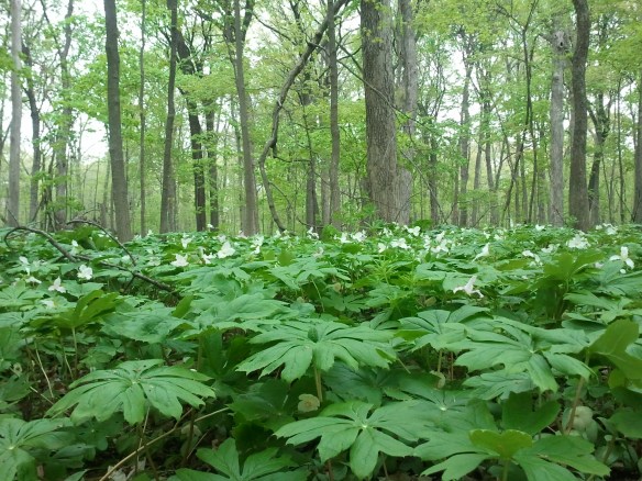 Late April through June you will see what looks like a collection of miniature green umbrellas scattered across the forest floor. These are the leaves of mayapple (Podophyllum peltatum), which are typically left untouched by herbivores due to their poisonous quality and bitter taste. Fertile mayapple plants produce a pair of leaves and a single white bloom that is pollinated by a variety of insects.
