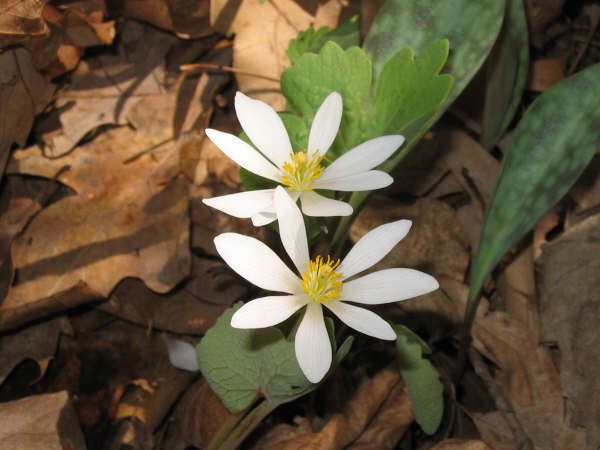 SANCAD-20160404-002blood rootBloodroot (Sanguinaria canadensis) is also an early bloomer. While the species’ blooming period lasts two weeks, you have to catch them in the act. Each individual flower blooms for only one or two days. Bloodroot’s wavy leaf wraps around the stem in a protective embrace. The blood-red juice of the roots gives this plant its name and was used by Native Americans as a dye for fabrics and tools.