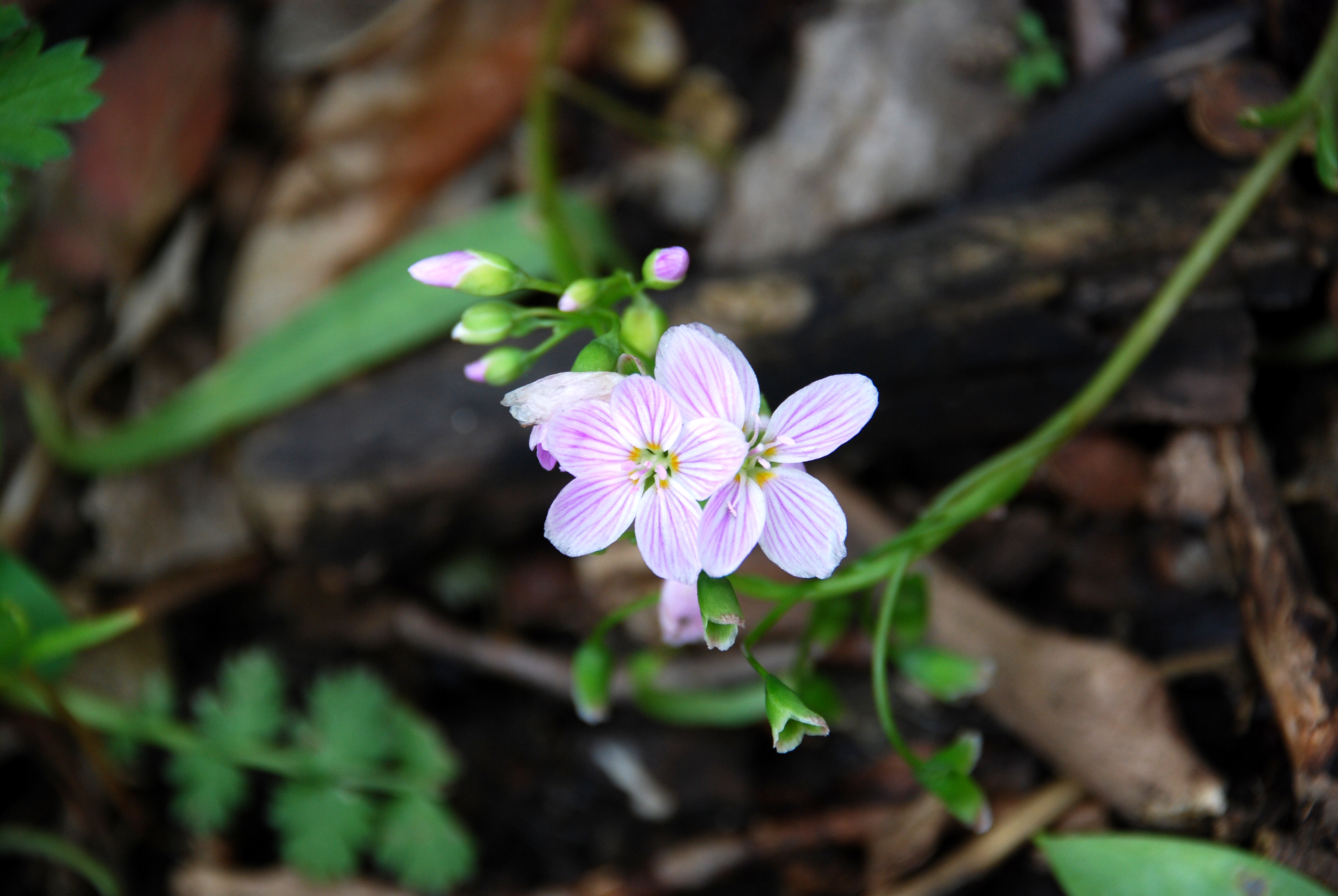 CLAVIR-CDWW-20140519-012More widespread are dainty spring beauties (Claytonia virginica) that grow in loose colonies. These small flowers have pale petals with pink stripes that are thought to act as “runways,” directing pollinators to the nectar and pollen. Spring beauties bloom throughout the spring, but be sure to look for them on sunny days. The blossoms droop and close on cloudy days.
