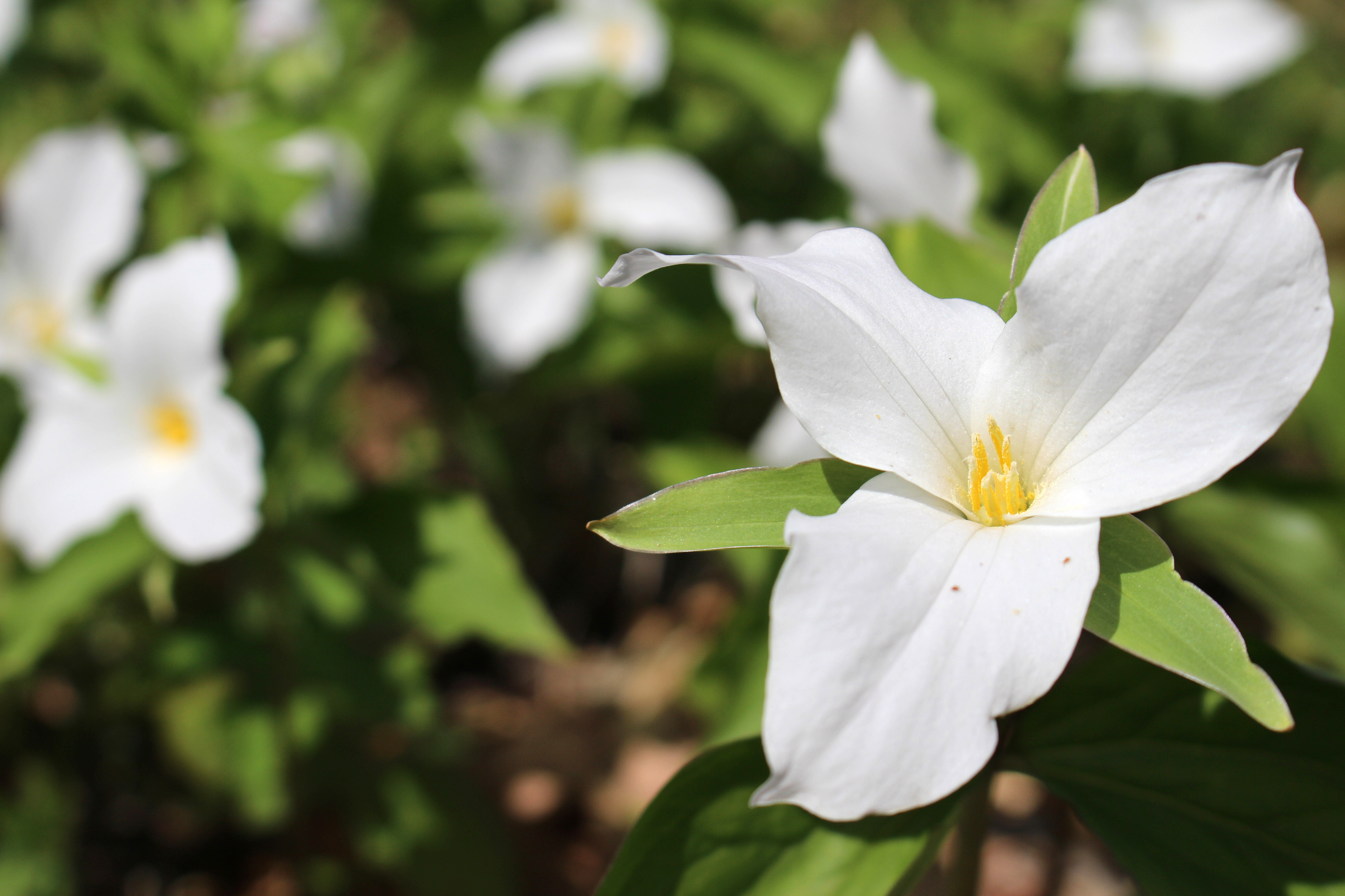 TRIGRA-CDWW-20140519-001Finally, the crown jewel of our spring woodlands has to be large-flowered trillium (Trillium grandiflorum). Revered for its showy, bridal-white flower, this gem blooms during May and June and is a favorite food for white-tailed deer. Once pollinated, trillium blushes pink before the blossom fades. Ants step in and trudge trillium seeds into their tunnels, thereby playing an important role in dispersal.