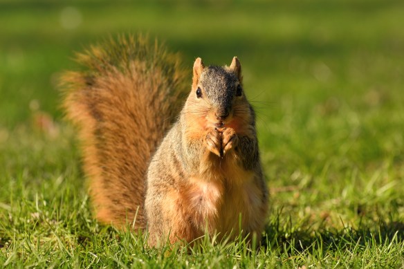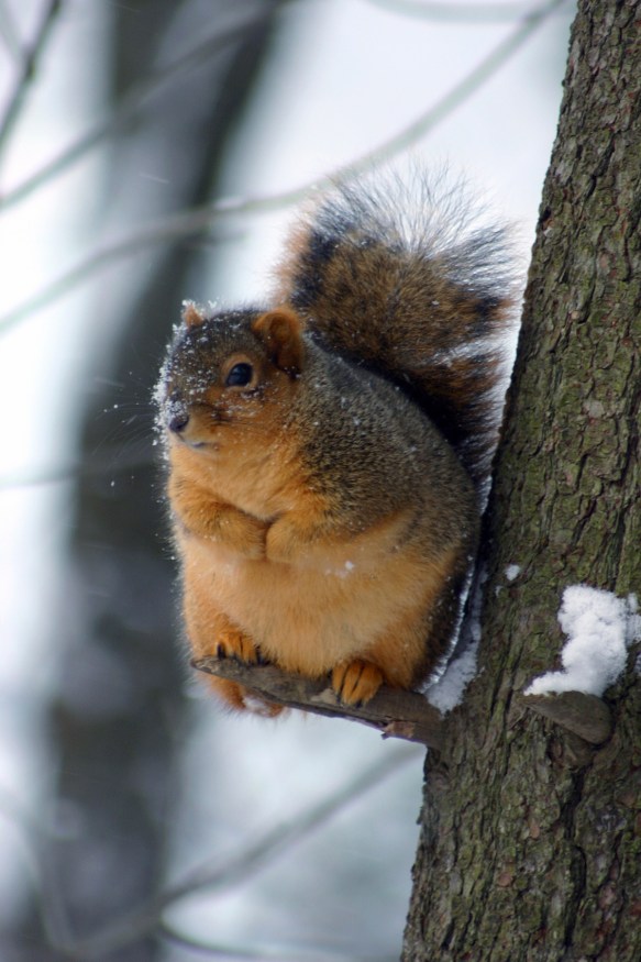 While both of these squirrels are ubiquitous in the area and generally share the same nesting behaviors and nut-centric diet, they are physically different and prefer different habitats. Gray squirrels have primarily gray fur on their backs, white fur on their bellies, white-tipped tail hairs, and are generally smaller and more slender than fox squirrels. Fox squirrels are more burley than gray squirrels with a reddish outer coat and a buffy belly and the tail hairs are tipped with reddish-brown. While both species can vary in color, the most common variation we see in Lake County, Illinois is a black squirrel which is merely a color morph of the eastern gray squirrel, and more common the further north you travel.