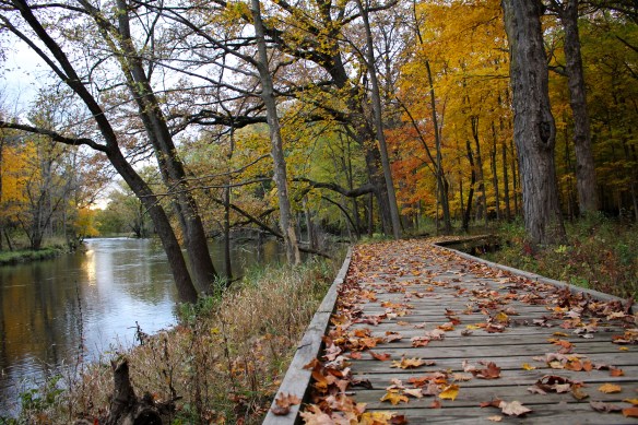 Since it’s fall, I’ve chosen trails in sunny areas that are just right to offset the cool autumn breezes. Also on the agenda are walks in woodland preserves where fallen leaves carpet the trail, creating nature’s artwork: unique mosaics of colors and patterns.