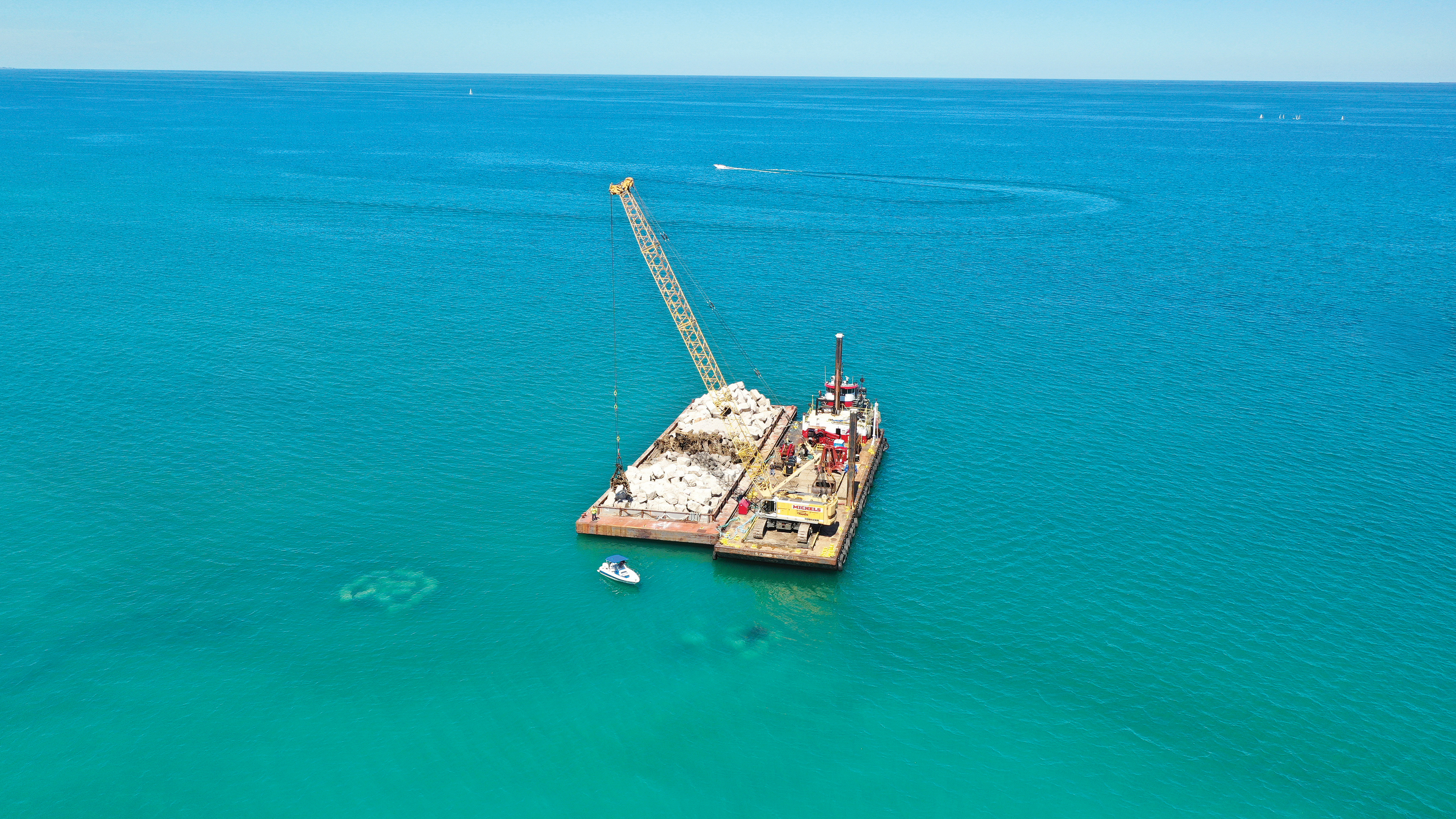 In 2020, the Forest Preserves and the U.S. Army Corps of Engineers Chicago District tried a different approach. A contractor built several underwater reefs parallel to Fort Sheridan’s lakeshore. Made from limestone slabs, tree trunks and branches, boulders and cobblestones, the reefs steer sand toward the shore from their sunken positions 10–13 feet below the surface.