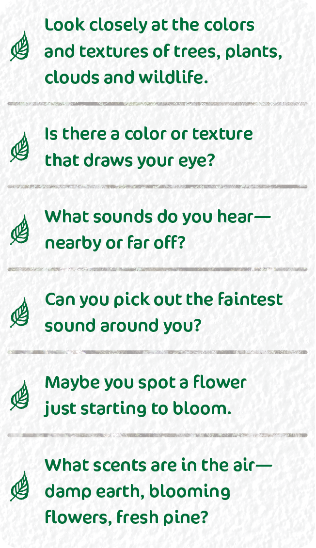 - Engage your senses. Notice the color of the leaves, the sound of birds, the texture of tree bark, the scent of the air. Try feeling the breeze on your cheek or noticing how the light filters through the trees.