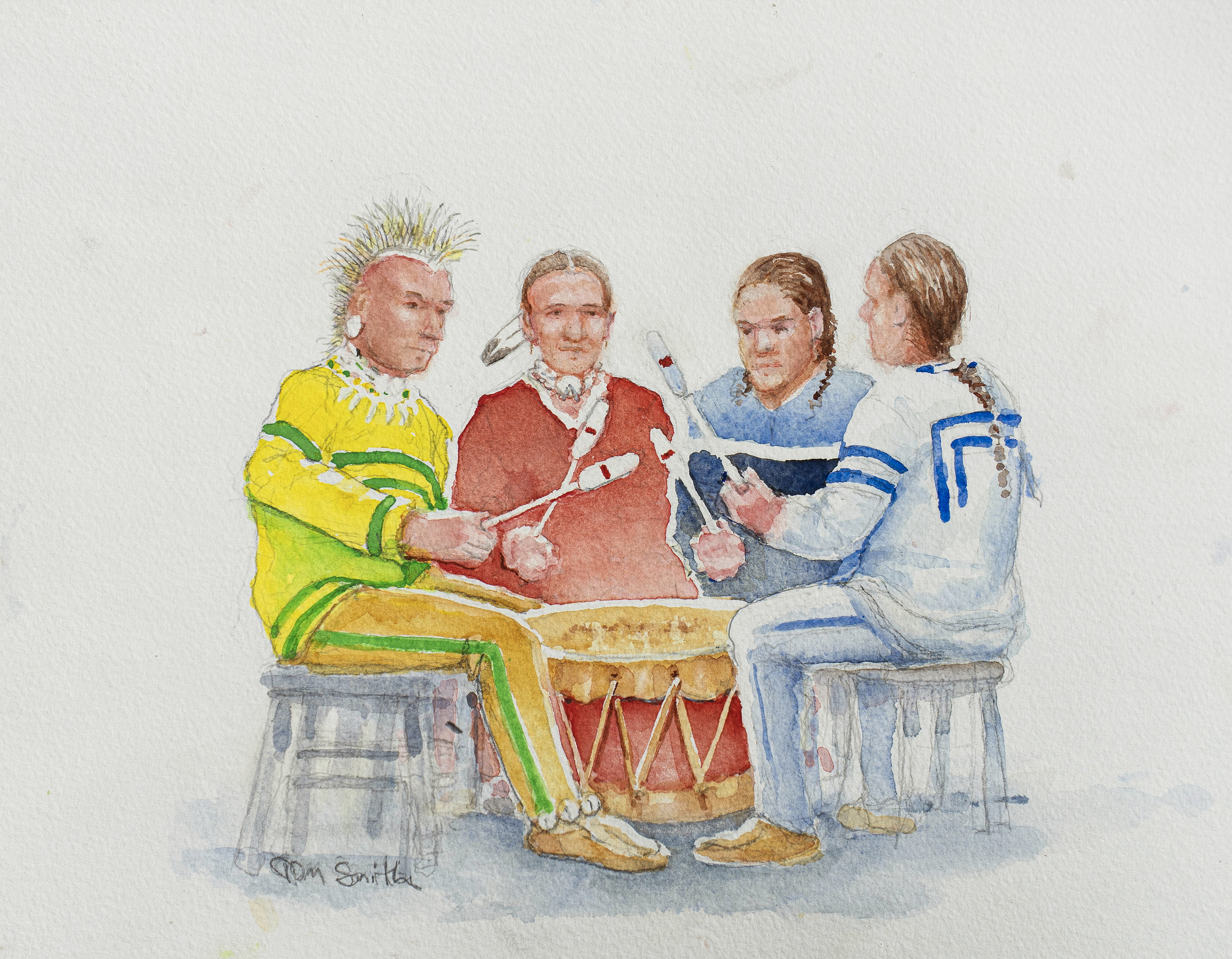 Rhythms of Life: The songs and rhythms of the drum circle are passed down through generations. Today, drummers of all backgrounds gather around the large Pow Wow drum—the heartbeat of Mother Earth—singing and drumming in community. Watercolor by Tom Smith.