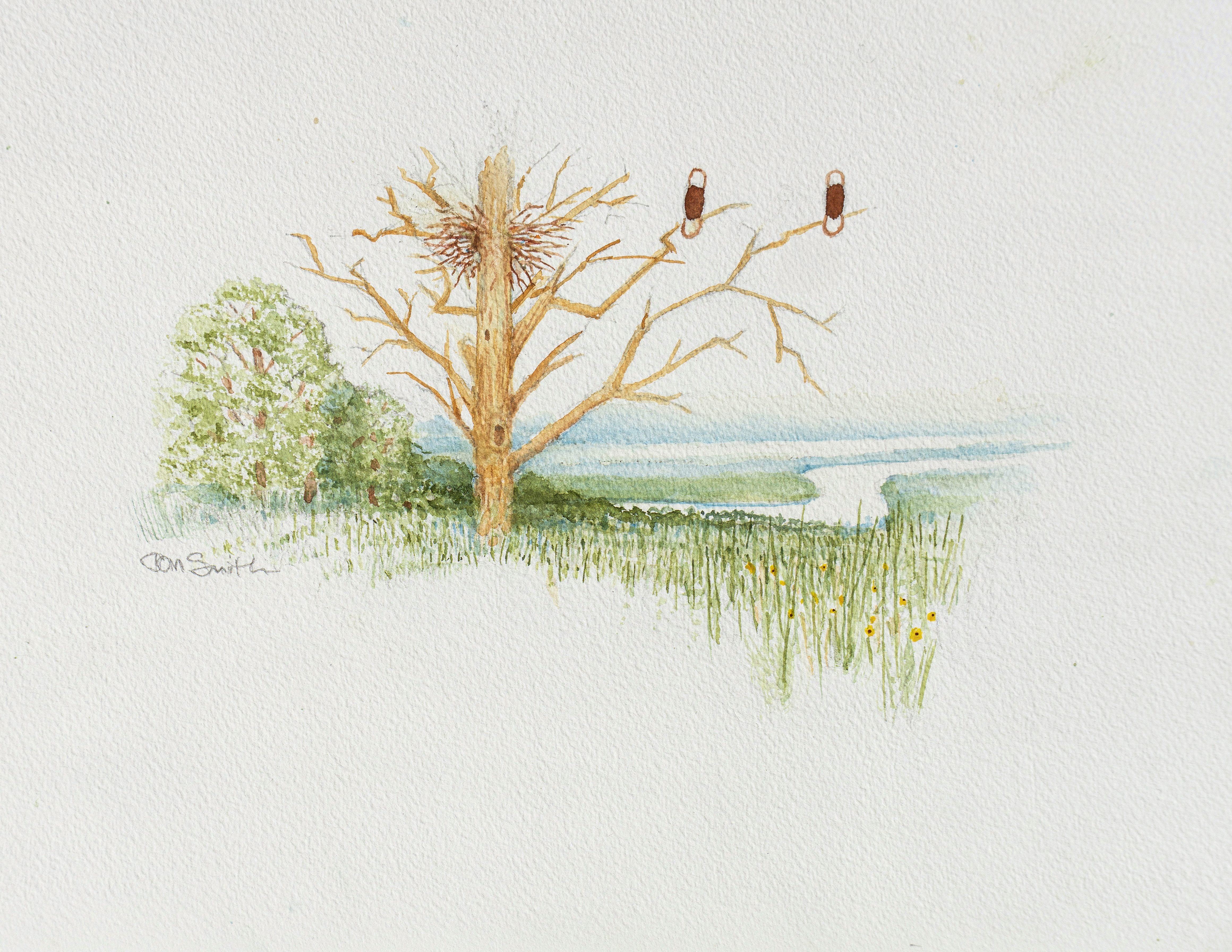 View from Gander Mountain: From the top of Gander Mountain in Antioch—Lake County’s highest natural elevation—two bald eagles survey the Fox River region, an area rich in Indigenous history. Watercolor by Tom Smith.