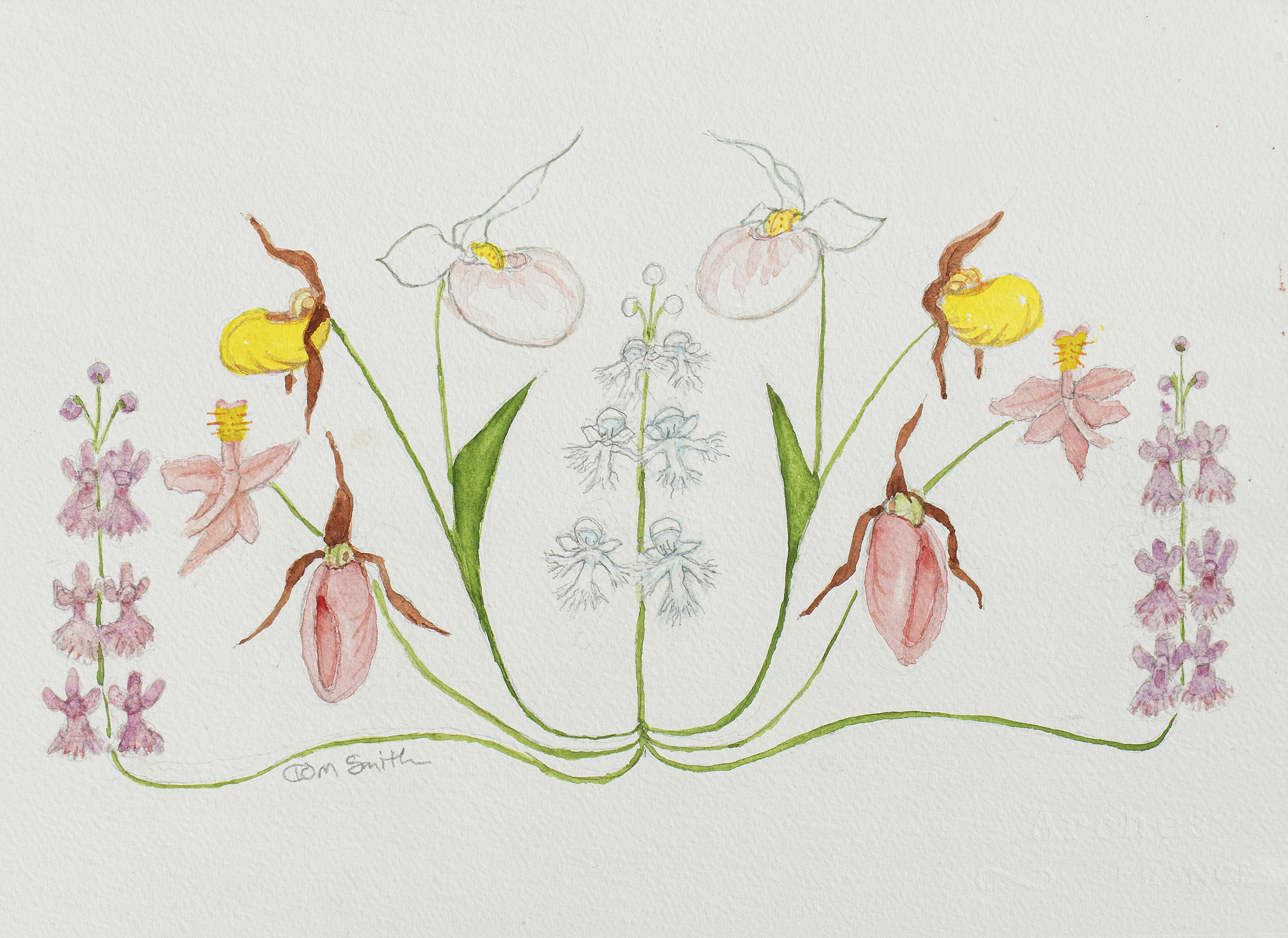 Orchids of Illinois: Combining traditional Woodland designs and local native plants, this motif features orchid species found in northern Illinois. Watercolor by Tom Smith.