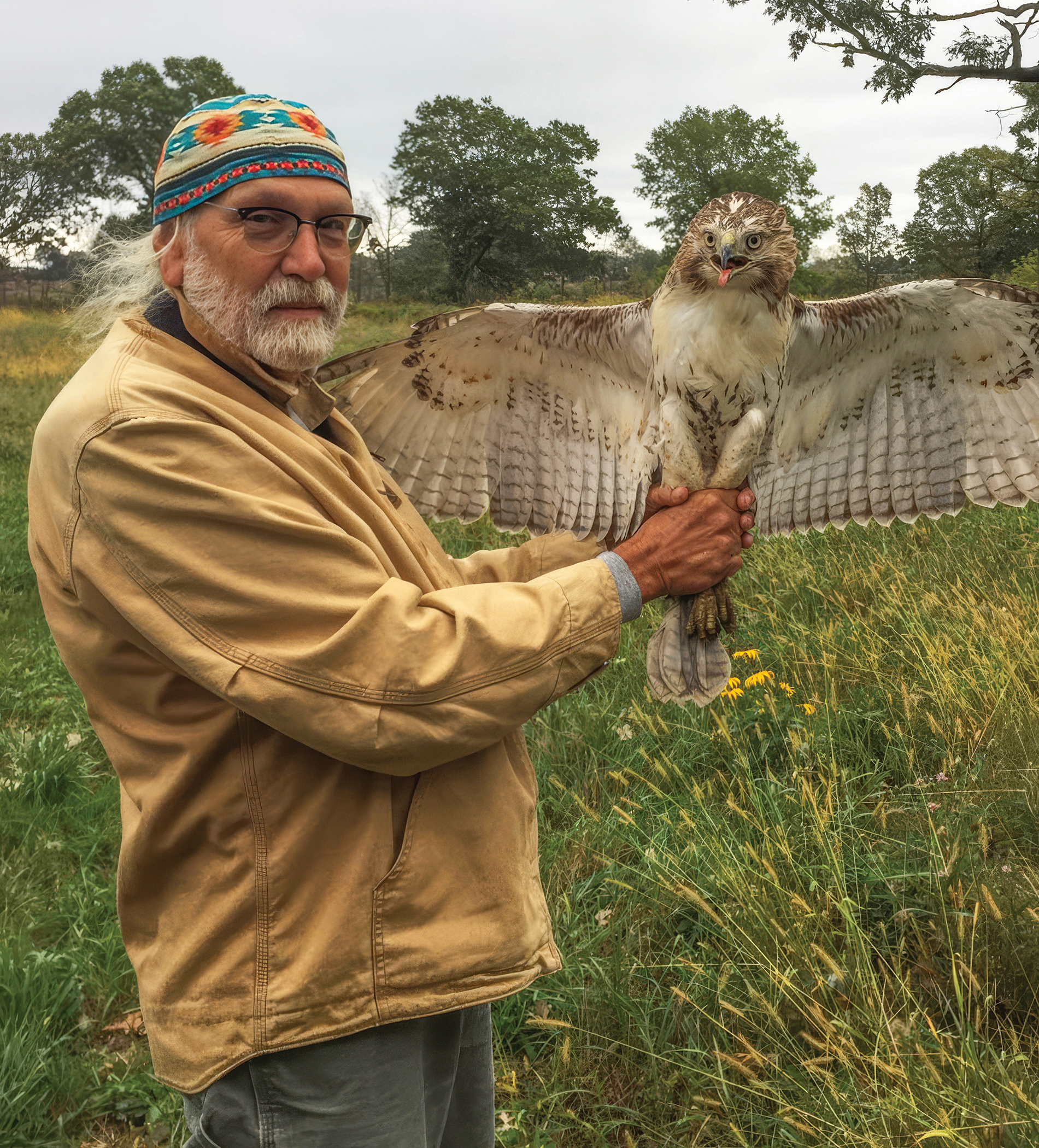 Smith holds a red-tailed hawk (Buteo jamaicensis) for a raptor banding research project in Wisconsin.