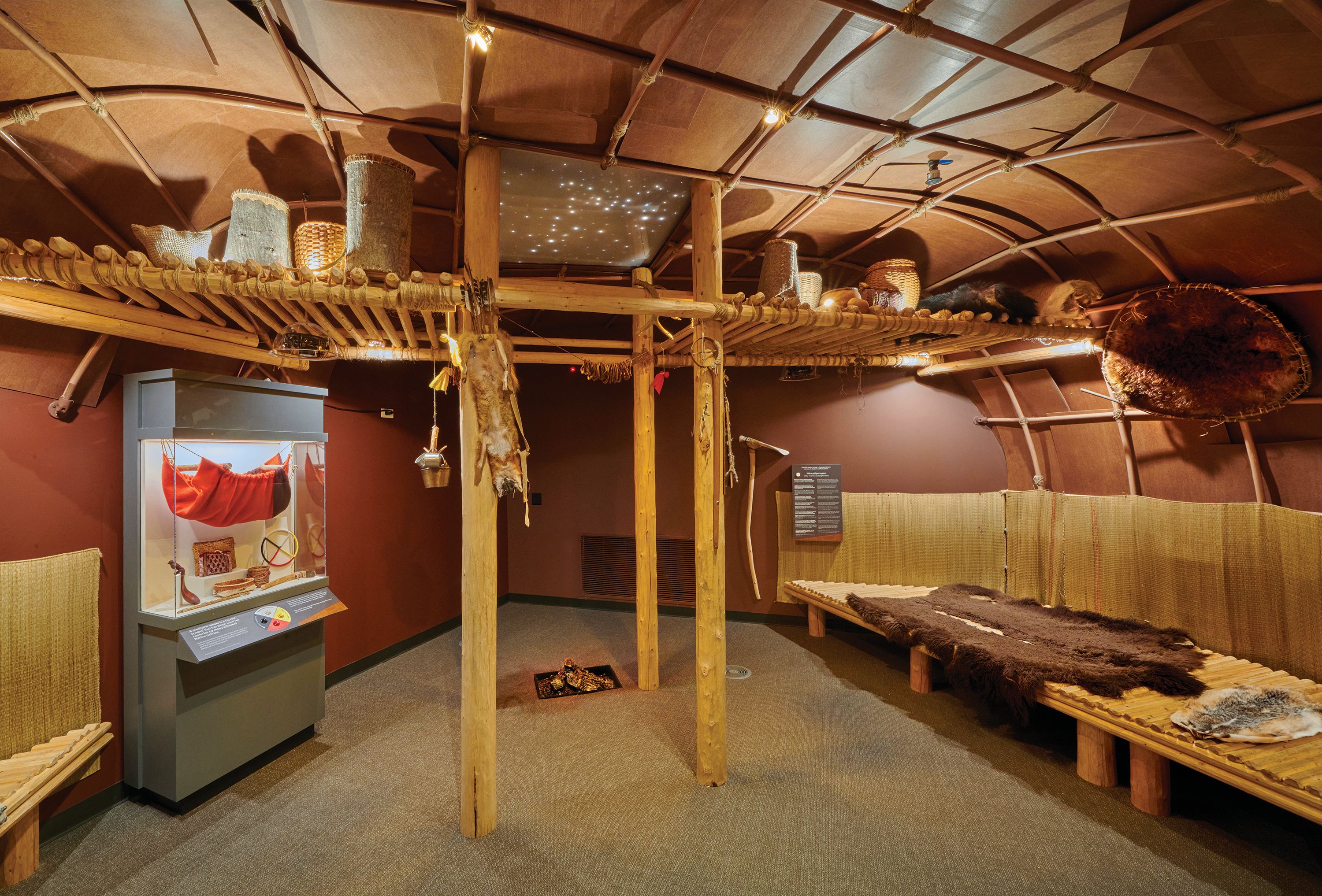 Soon after entering the Museum, visitors turn a corner into the First Peoples gallery. There, a replica wigwam stands for them to enter.