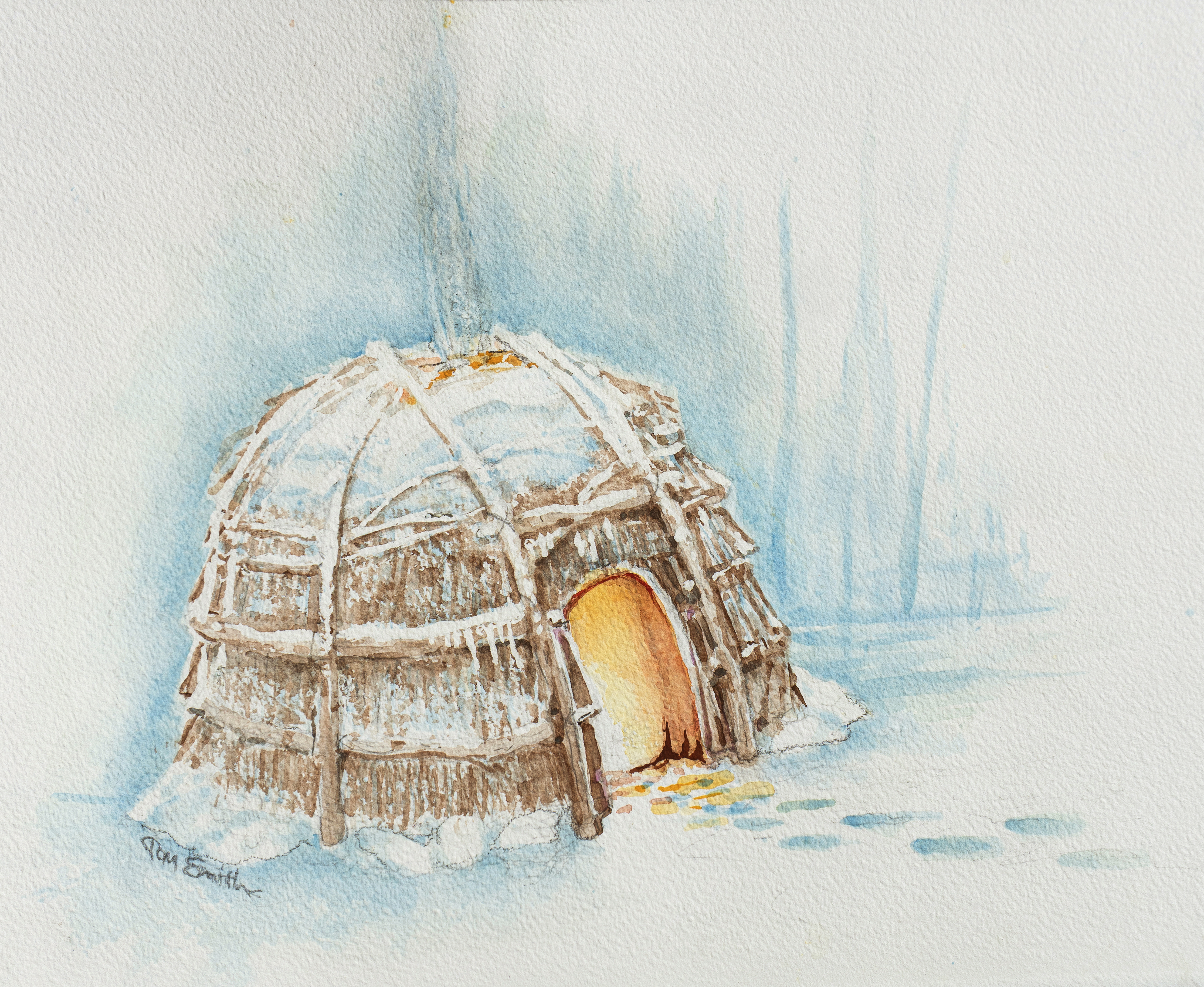 Home: A wigwam is a single-family home of the Potawatomi, built upon strong poles made from bent tree saplings and covered with sheets of bark. Layering the walls with woven mats and dried grasses helped keep winter weather out. Watercolor by Tom Smith.